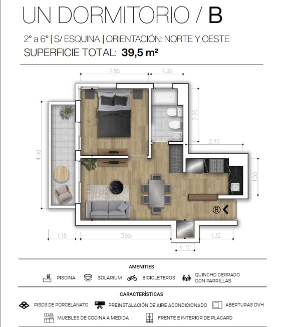 Proyecto Grand Alvear Land, unidades de 1 dormitorio al frente desde 34 m² hasta 53 m². Edificio en construcción de planta baja y 10 pisos, ubicado en una excelente zona de Rosario. Cuenta con terraza, solarium, piscina, quincho y bicicleteros. Departamentos con aberturas DVH, frentes e interiores de placard y pre-instalación de aire acondicionado. Compuesto por 2 ambientes: 1 dormitorio, 1 baño y balcón. Las imágenes son ilustrativas y no contractuales.